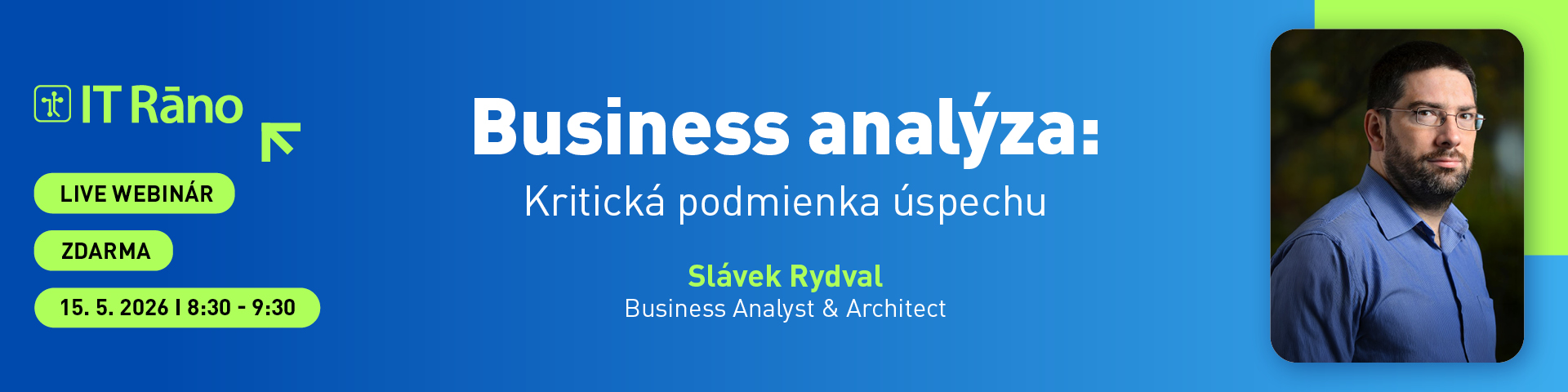 Slávek Rydval je expertný business analytik a solution aj business architekt, ktorý prináša poriadok a jasnú víziu do komplexných technologických projektov. S hlbokými koreňmi v telekomunikáciách a bankovníctve, od vzniku prvej českej internetovej banky až po inovatívne digitalizované riešenia, sa nekompromisne riadi princípom: najprv dôkladne identifikovať skutočné potreby businessu a až potom navrhovať funkčnú architektúru.