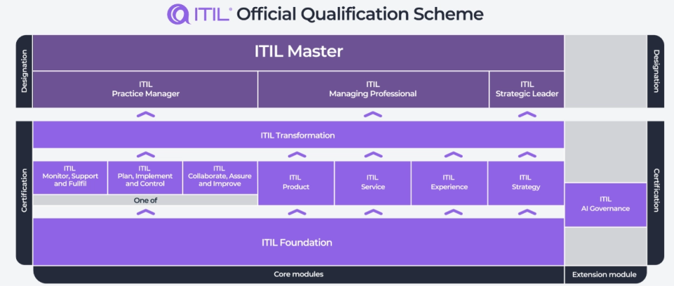 | Certifikačná schéma | ITIL 4 schéma (Foundation → MP/SL a ďalšie moduly podľa AXELOS/PeopleCert). | Nová schéma V5: Foundation ako univerzálny prerequisite; nové Core moduly (Product, Service, Experience, Strategy, Transformation) + možnosť „AI Governance" bez prerequisite; nové označenia (Practice Manager, Managing Professional, Strategic Leader, Master). |